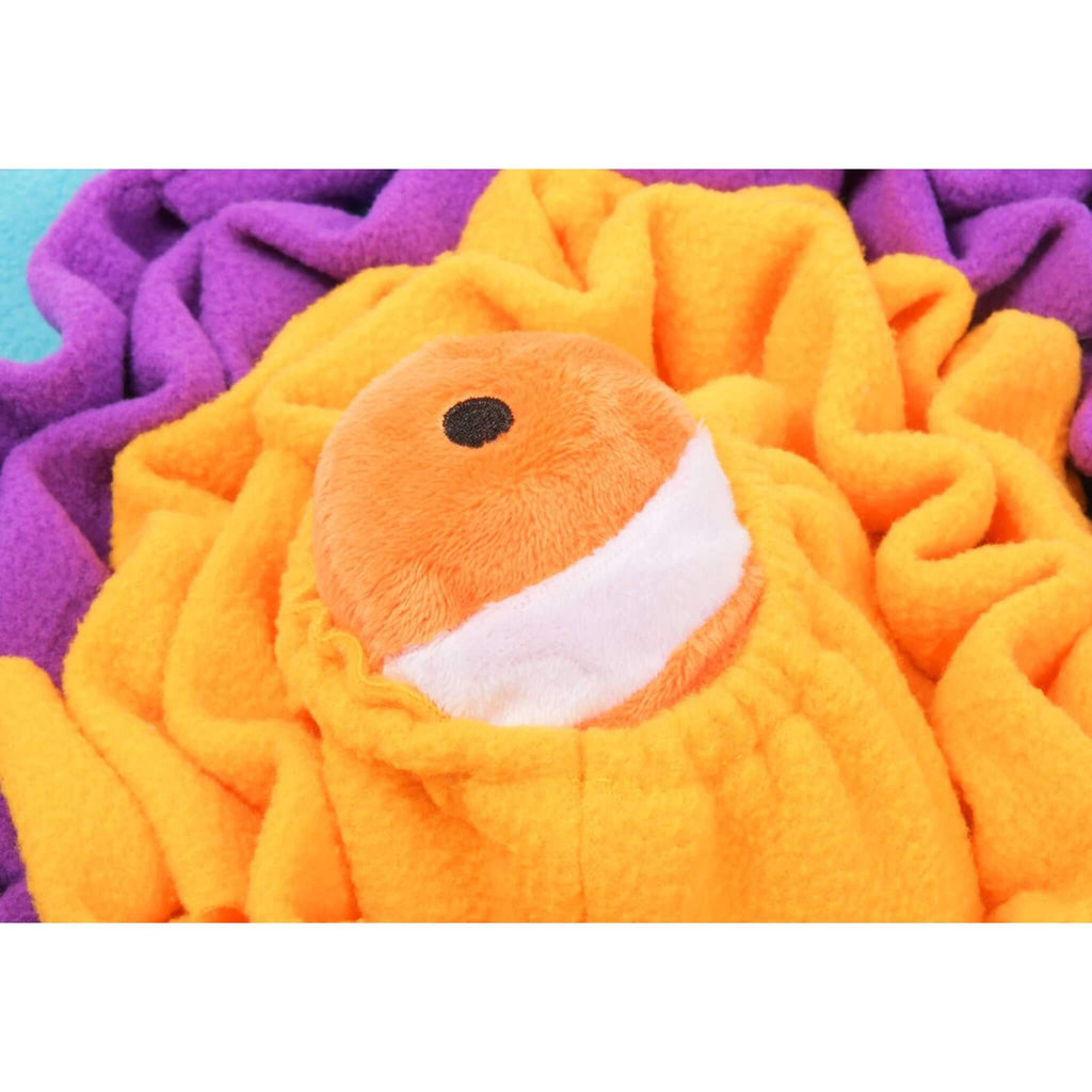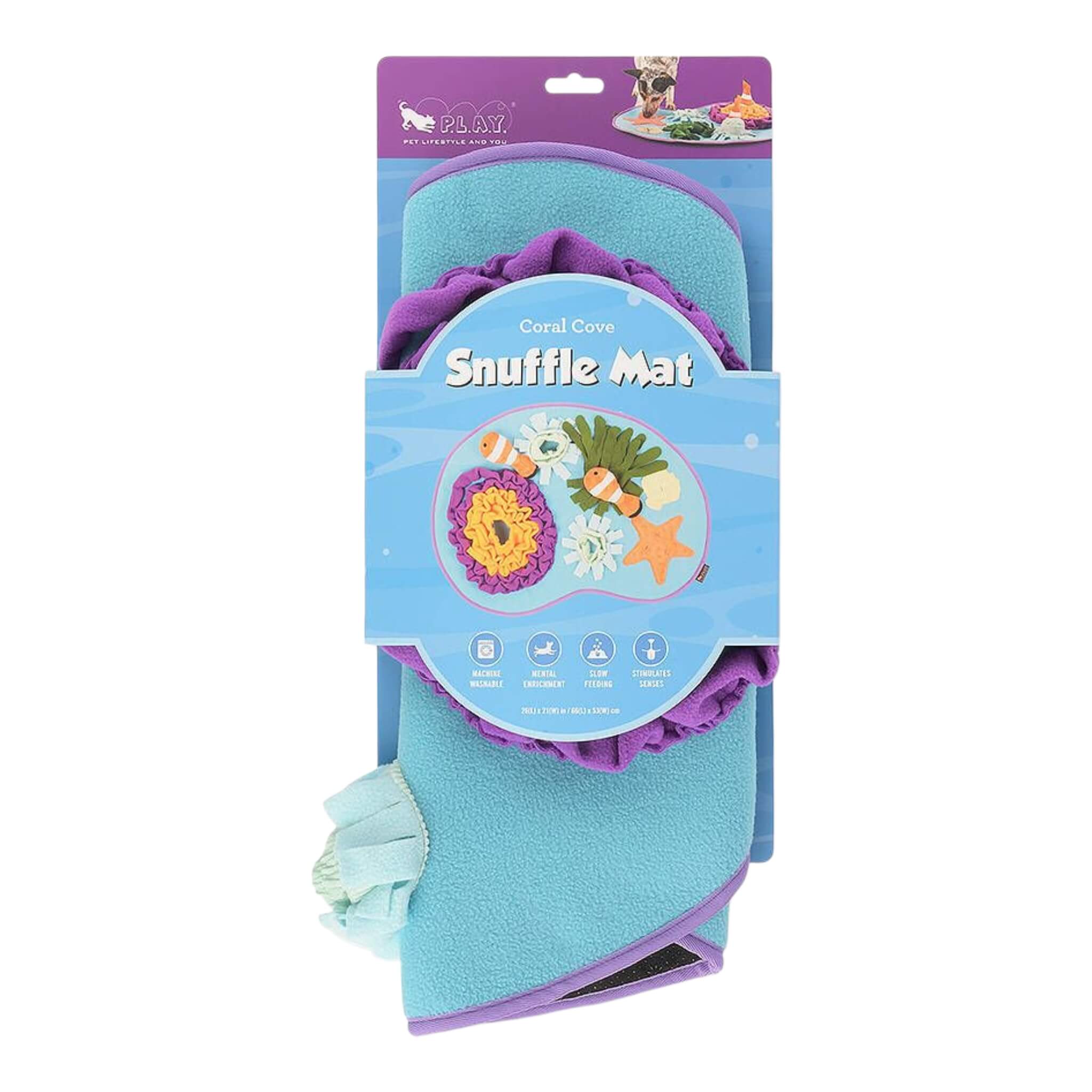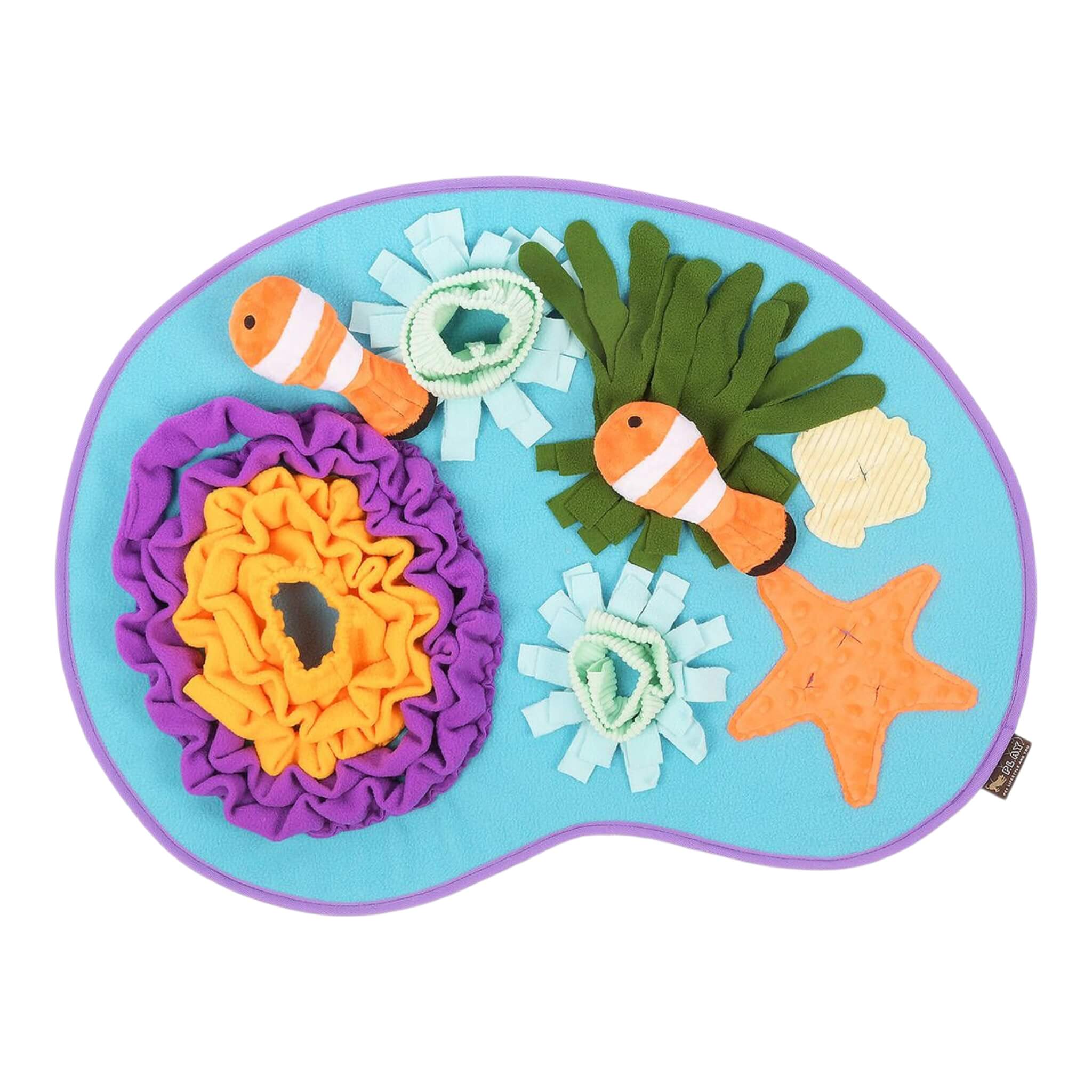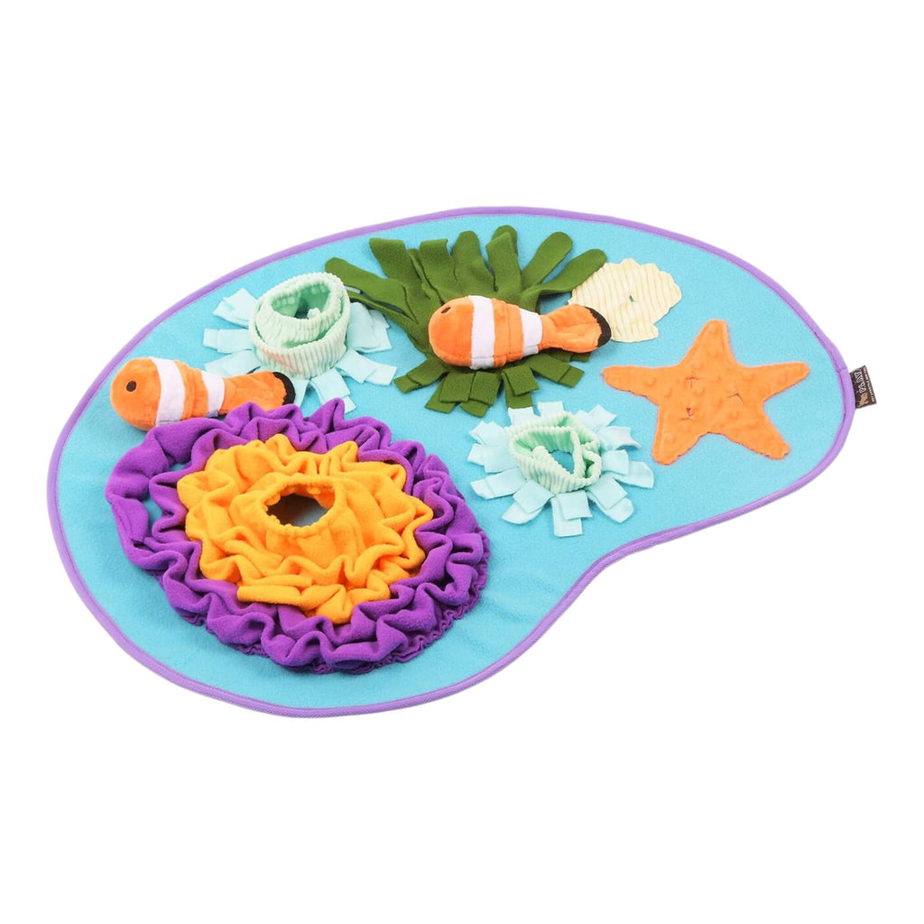 Dive into the wonders of the undersea world with P.L.A.Y. Pet Lifestyle and You's Coral Cove Snuffle Mat. This aquatic adventure toy is designed for endless engaging play as your pet explores hidden delights, sniffing, searching and finding treats. This captivating snuffle mat is sure to become a firm favorite. The mat comes complete with two detachable clown fish containing squeakers for added interactive fun.