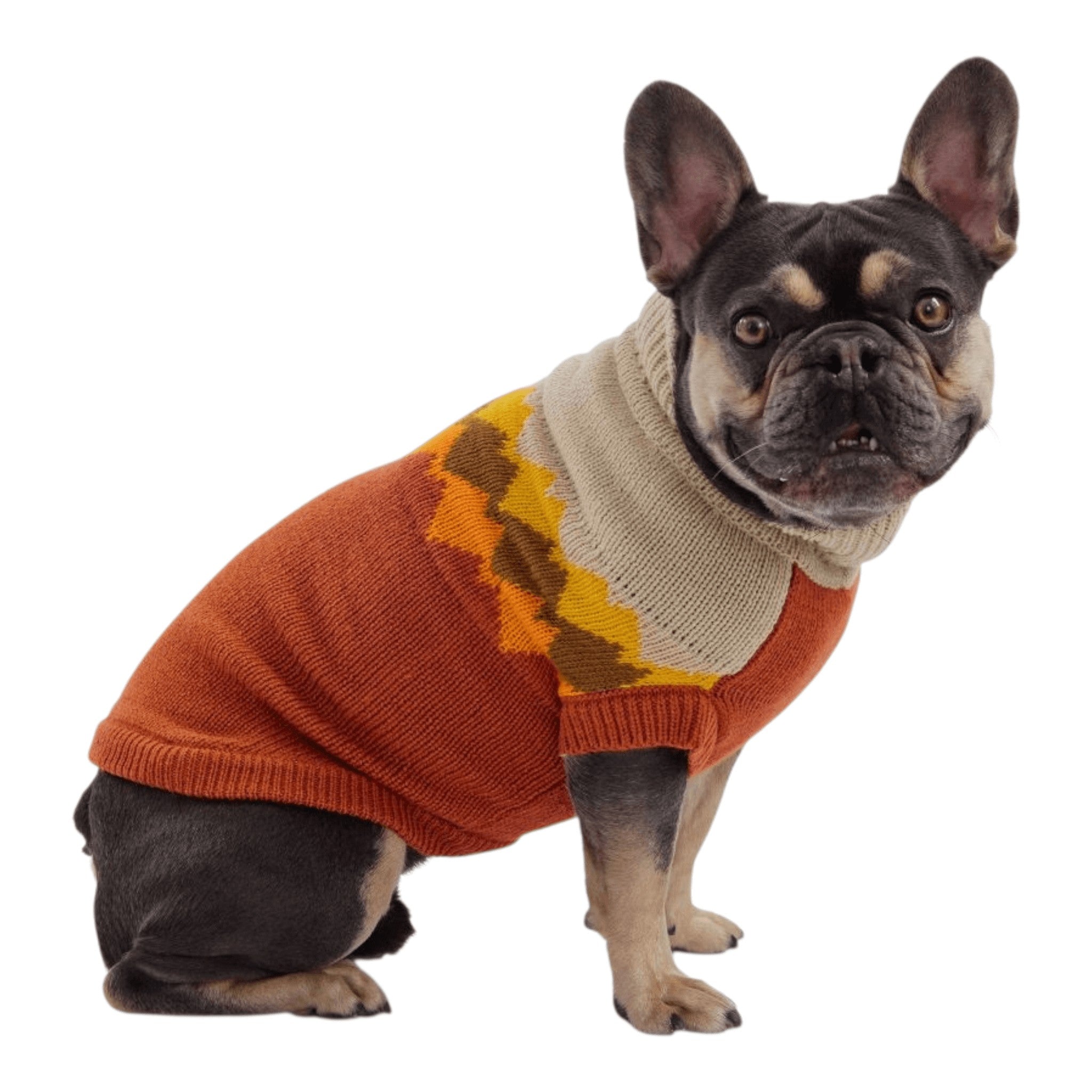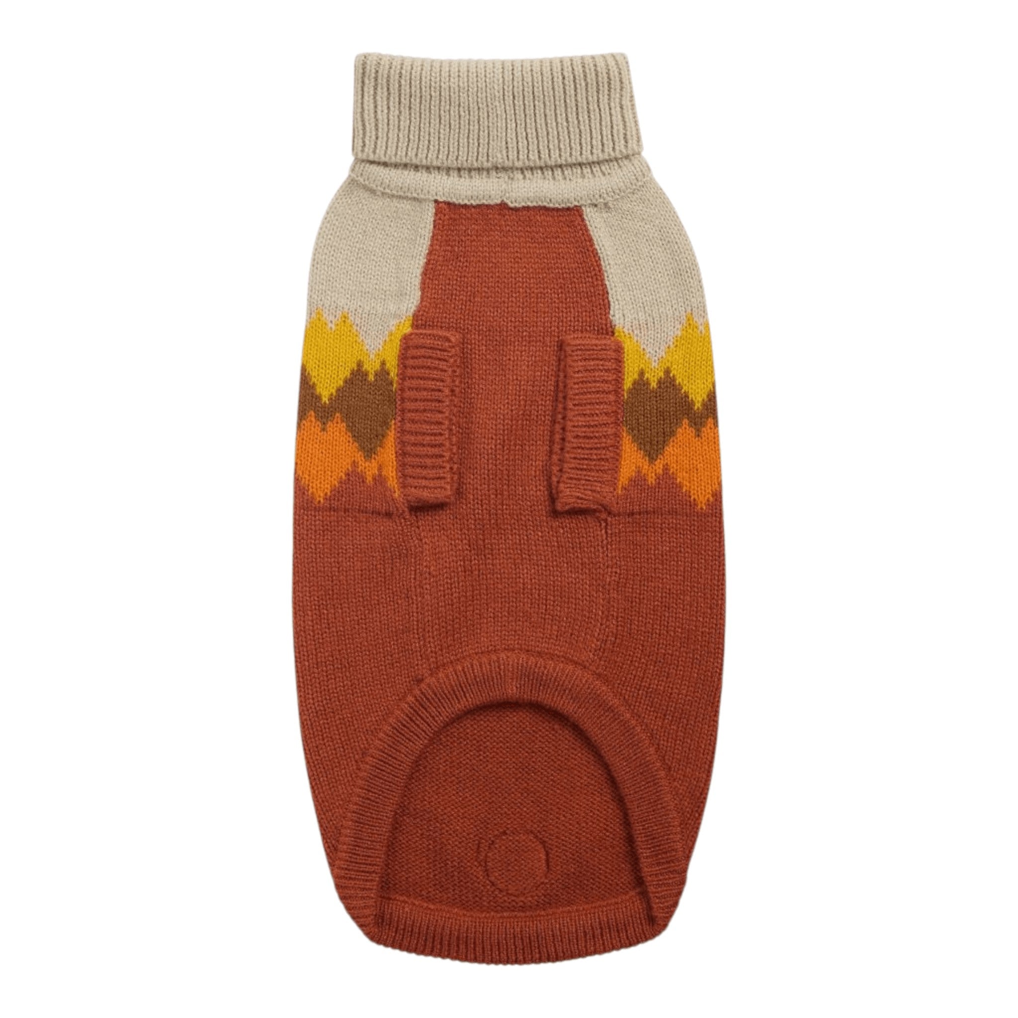 Wrap your best friend in the cozy warmth in GF Pet's vintage style Fireside Dog Sweater in Chili. This unique, top-quality multi-knit turtleneck sweater is the perfect blend of warmth, comfort, mountain-lodge inspired fashion. The eye-catching Chili design features a classic, retro, geometric pattern with warm, inviting color combinations that remind one of cozy evenings by the fire. This is definitely a must-have item for any dog's closet!