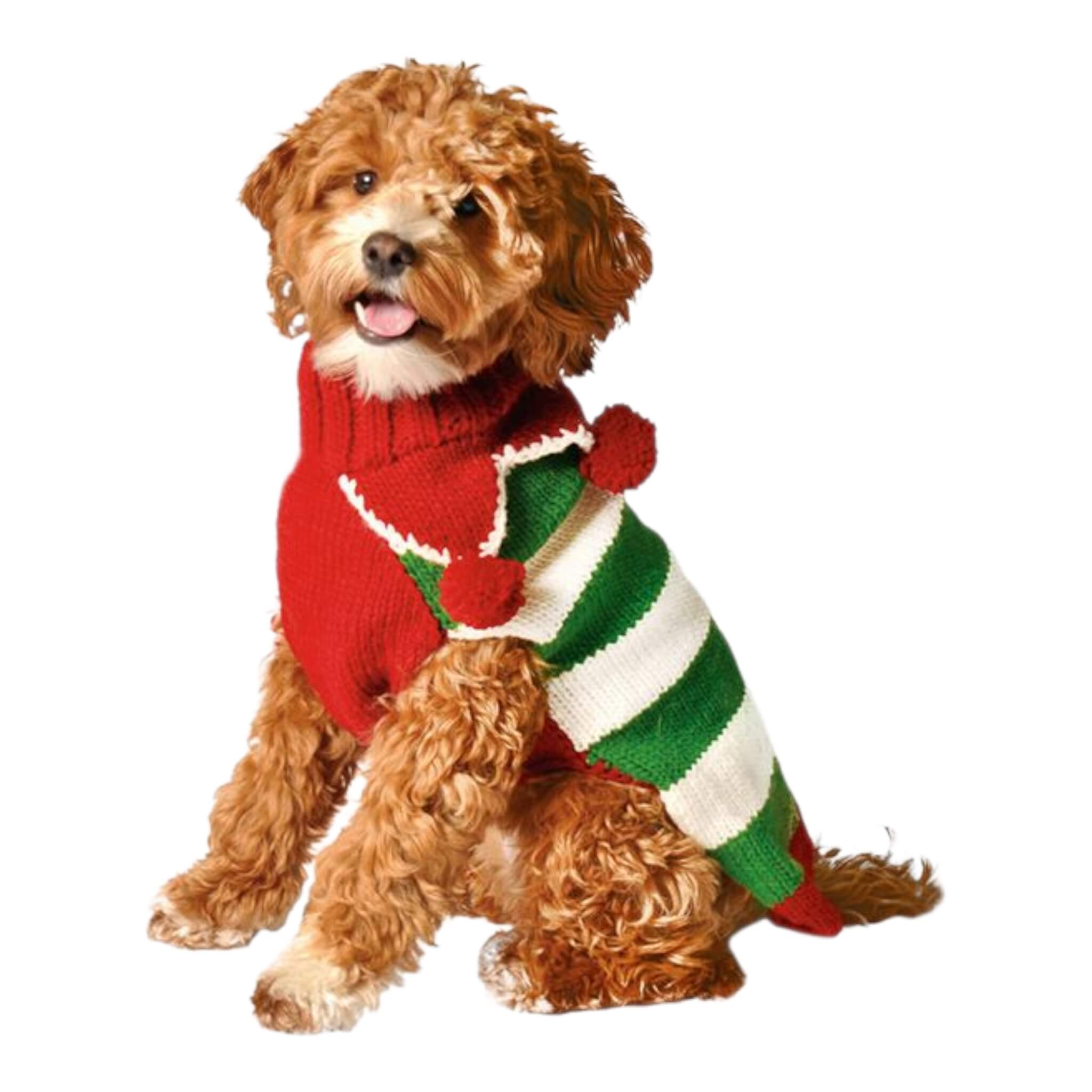 Perfect for Christmas Holiday celebrations, your dog will definitely look the part when he's wearing the Christmas Elf Holiday Dog Sweater by Chilly Dog. This beautiful dog pullover is hand-knitted with a luxurious blend of wool and soft alpaca, offering superior warmth as the natural fibers have greater bulk, preventing air pockets.
