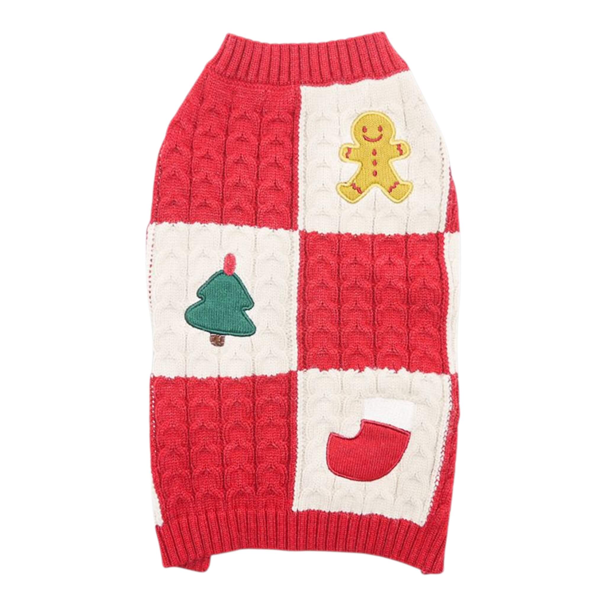 Made from a soft, stretchable acrylic material, the sweater features a charming cable knit design with an attractive cubed pattern. The Christmas theme features three delightful appliques - a gingerbread man, a Christmas tree, and a stocking. The sweater is finished with a classic red ribbed trim for a secure and stylish fit, and there is a leash hole on the back for easy leash attachment. Practical and stylish, this one's a winner!