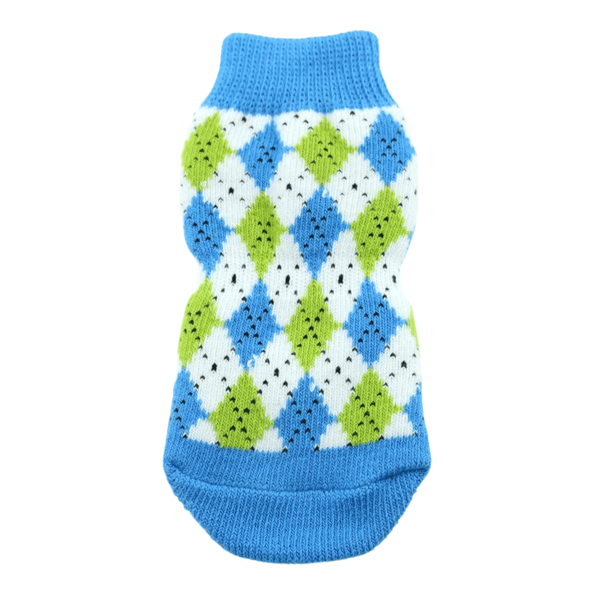 Hechos de 100% algodón, estos hermosos calcetines antideslizantes para perros están disponibles en cuatro fantásticos patrones: Argyle azul y verde, camuflaje verde, piña rosa y corazones rosas y blancos.