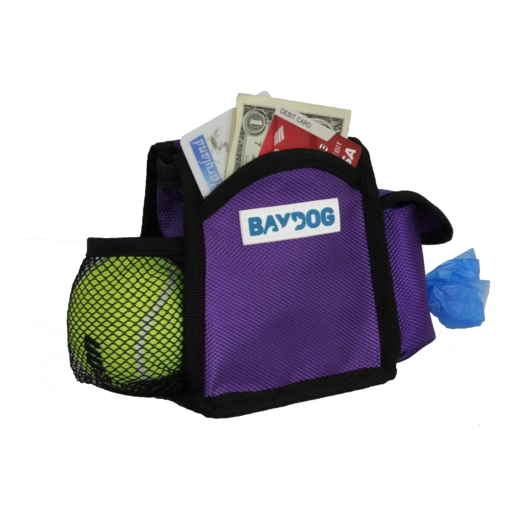 Pack-N-Go Bag in Purple with a ball compartment and poop bag dispenser for dogs
