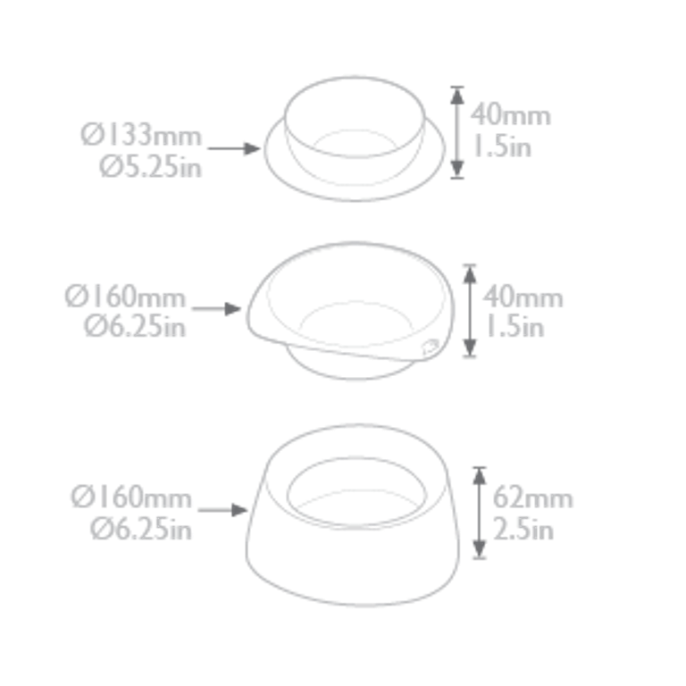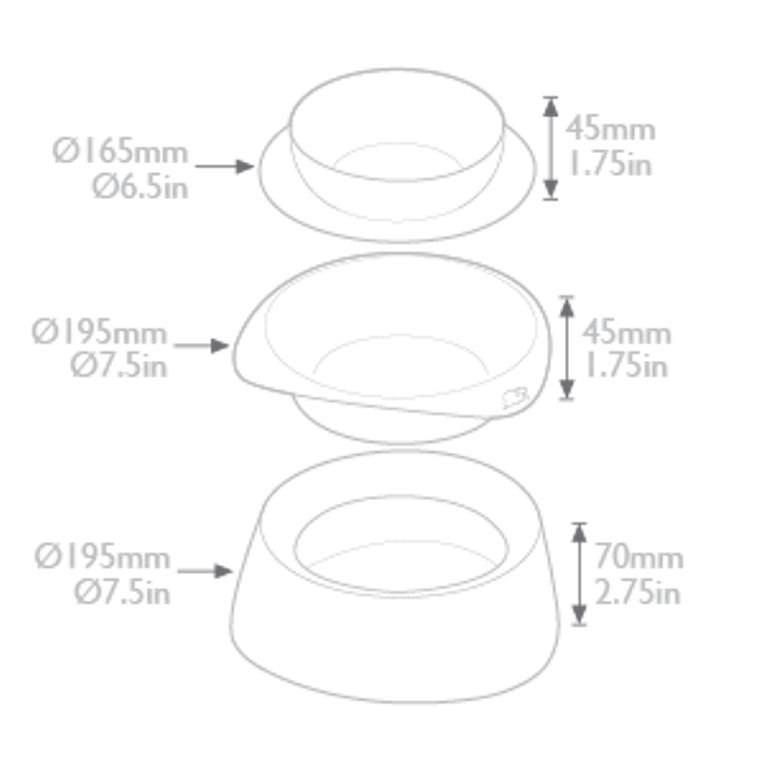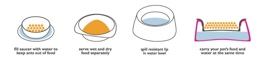 Los tazones cuentan con un tazón de agua resistente a derrames que sirve como base, un tazón de comida que se desliza dentro del tazón de agua para que no tenga fugas y una tapa que sella la unidad para que sea a prueba de derrames. La tapa se convierte en un recipiente adicional cuando se voltea, lo que permite servir alimentos secos, húmedos y agua en recipientes separados. Cuando la tapa se usa como plato de comida, la porción del platillo se puede llenar con agua para mantener a las hormigas fuera de la comida.