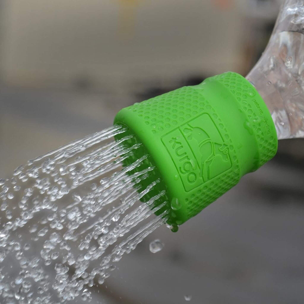 Fabricado con silicona de calidad alimentaria, el dispositivo se adapta a botellas de refresco PET estándar, que van desde 16 oz hasta 2 litros. Si utilizas una botella de 2 litros, puedes contar con una ducha que durará más de un minuto, perfecta para enjuagar toda la suciedad de tu aventurero canino.