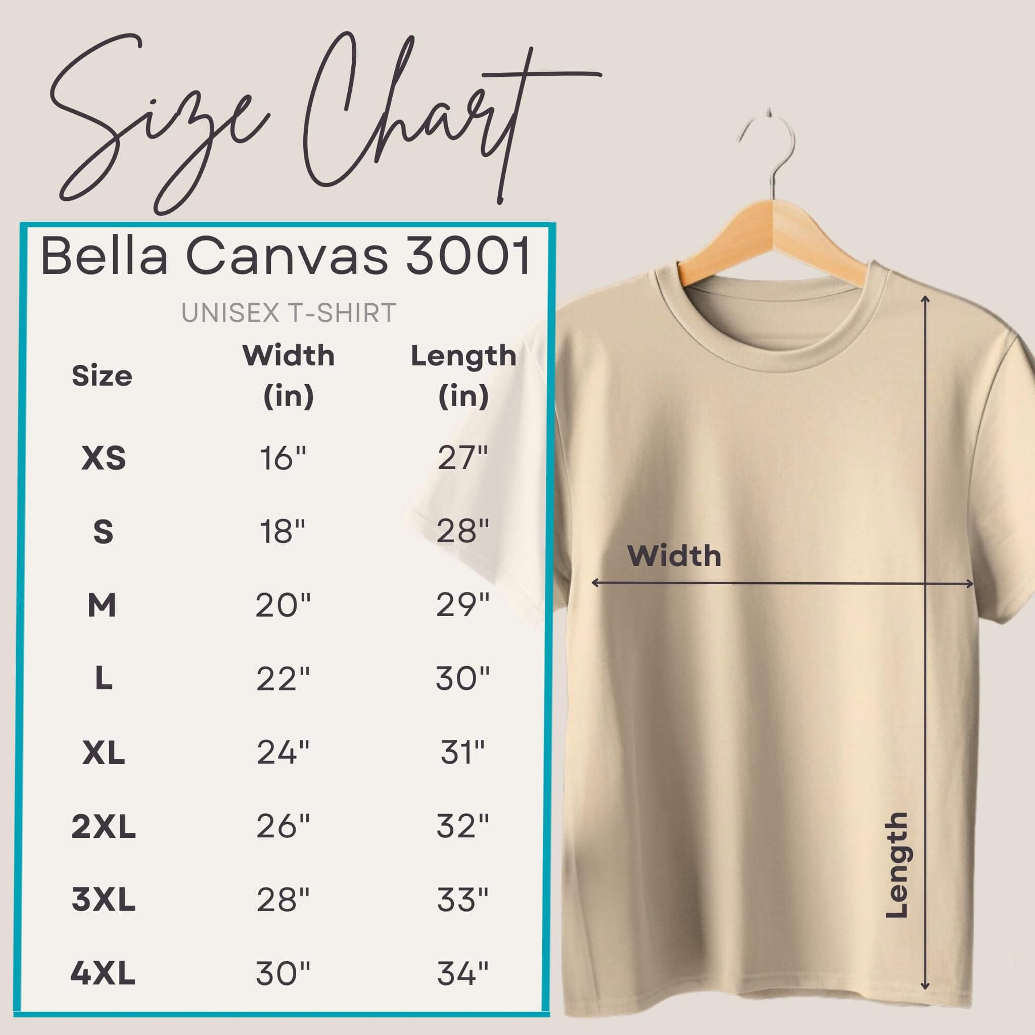 Size chart for Bella Canvas 3001 t-shirt with a beige t-shirt on a hanger.