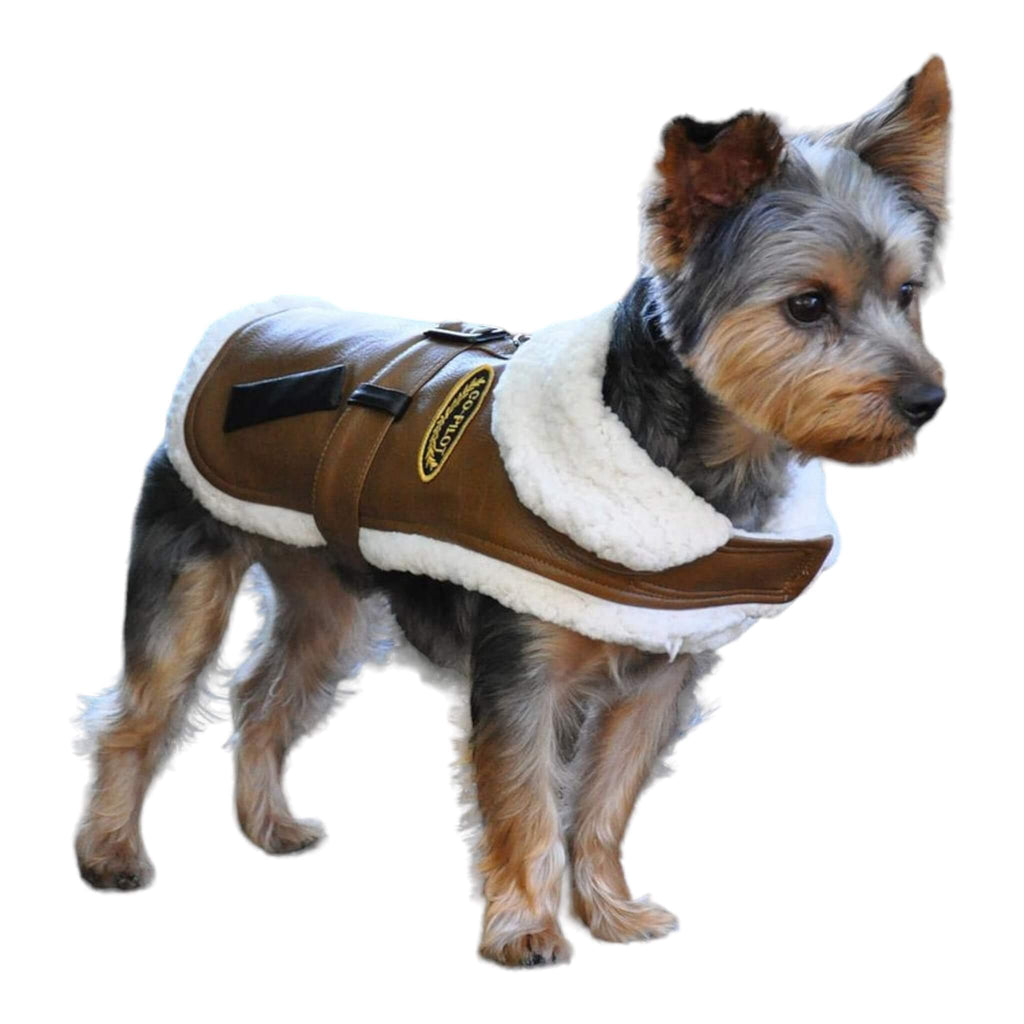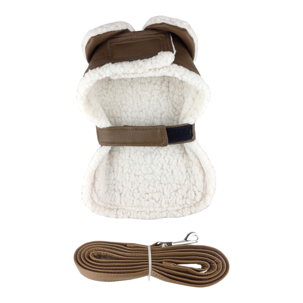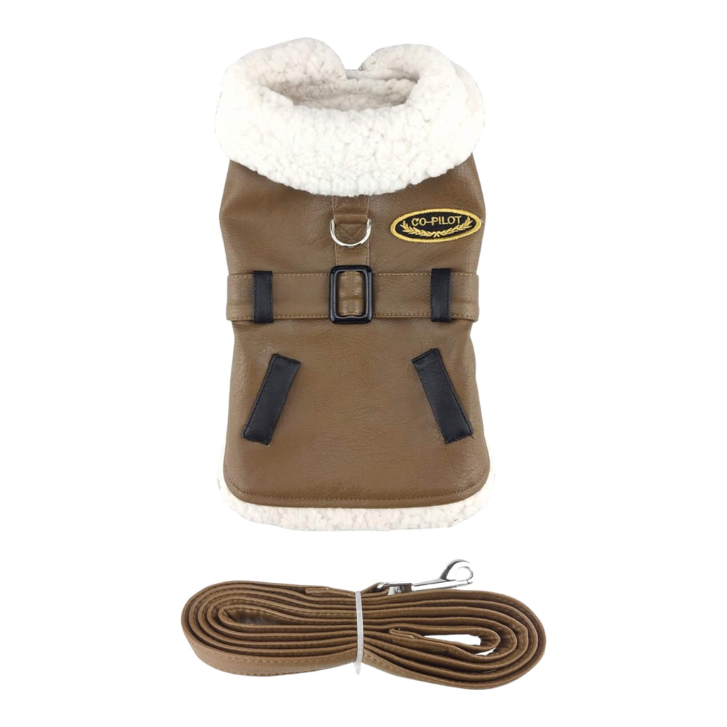 The exceptionally cute vintage-styled Bomber Dog Harness Coat features a matching leash so everything you need is right there. The outer layer features dark brown faux leather accessorized with black faux leather pockets and belt loops. An embroidered wings emblem with the words "Co-Pilot" complete the look.
