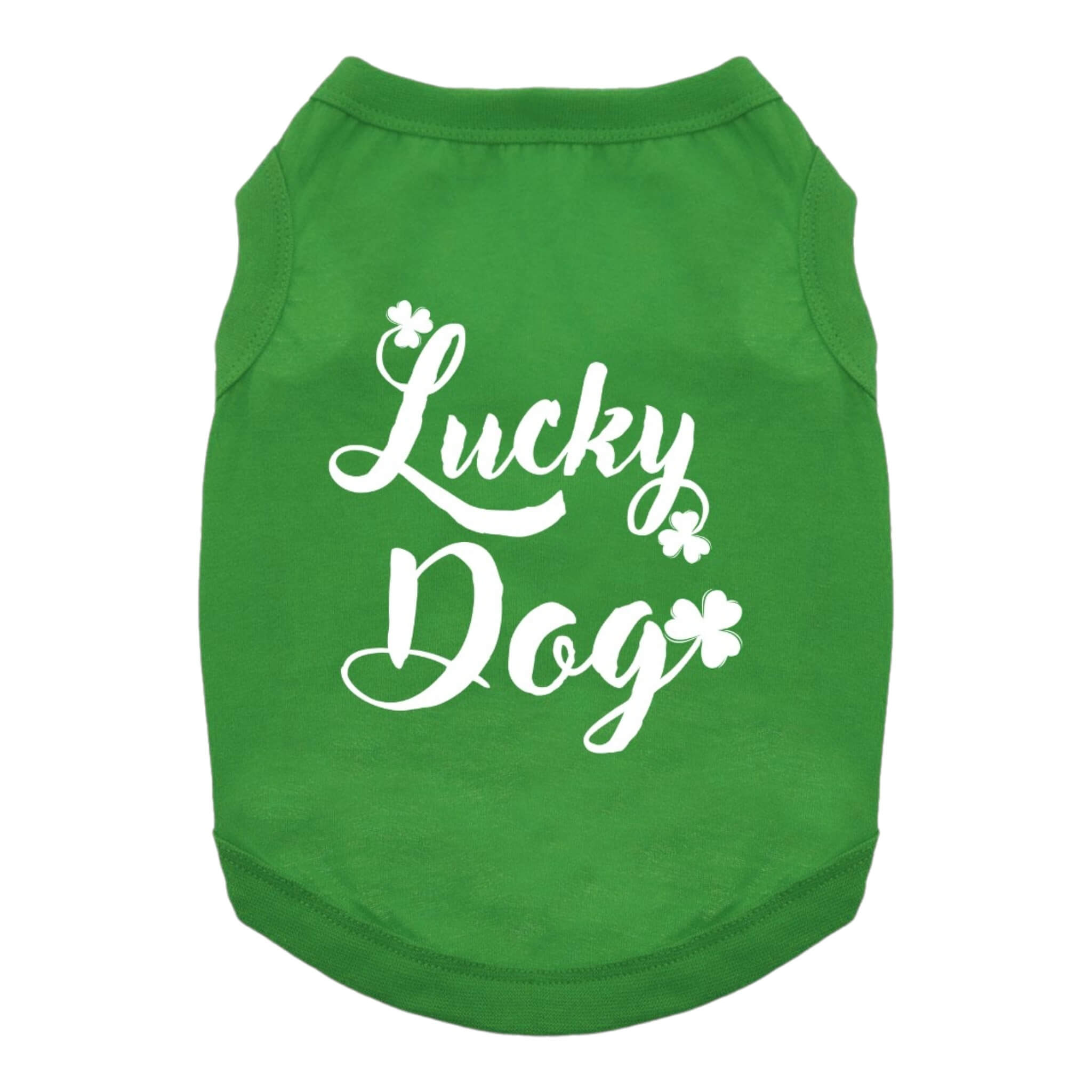 • Festive, emerald green T-shirt for dogs with "Lucky Dog" graphic