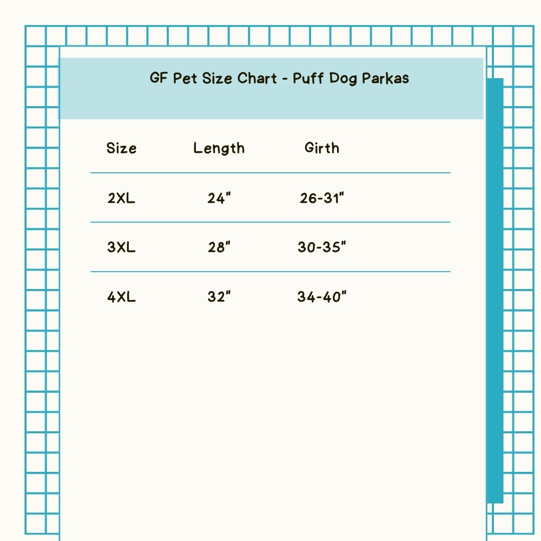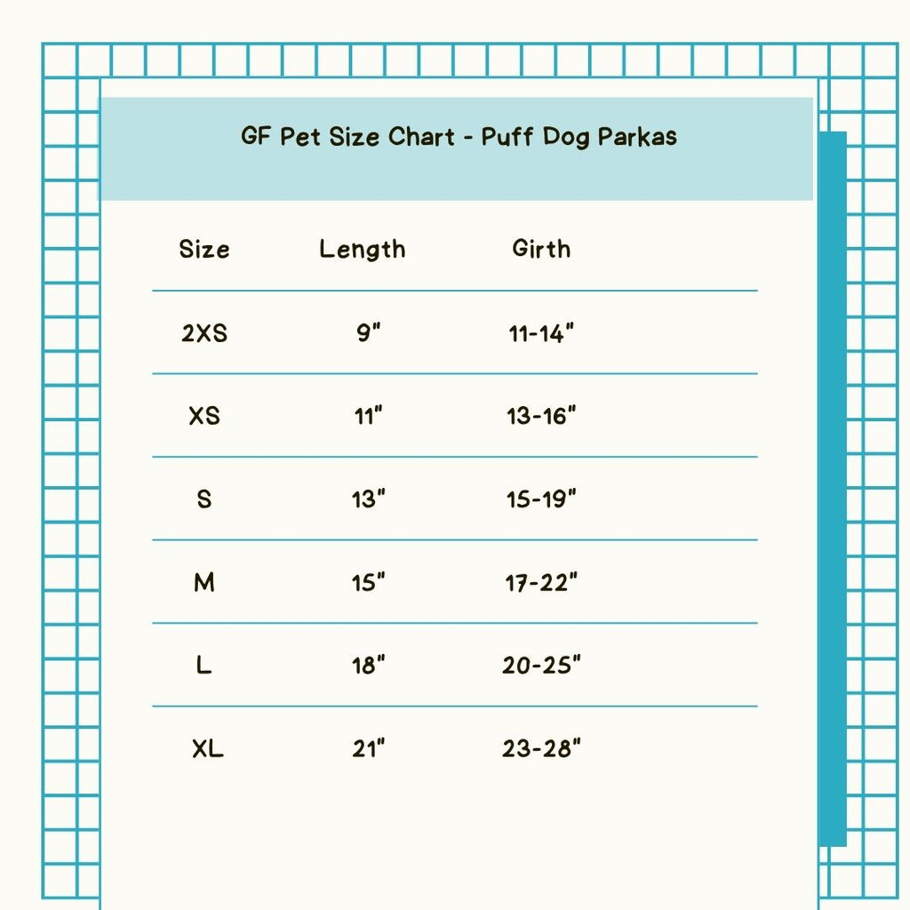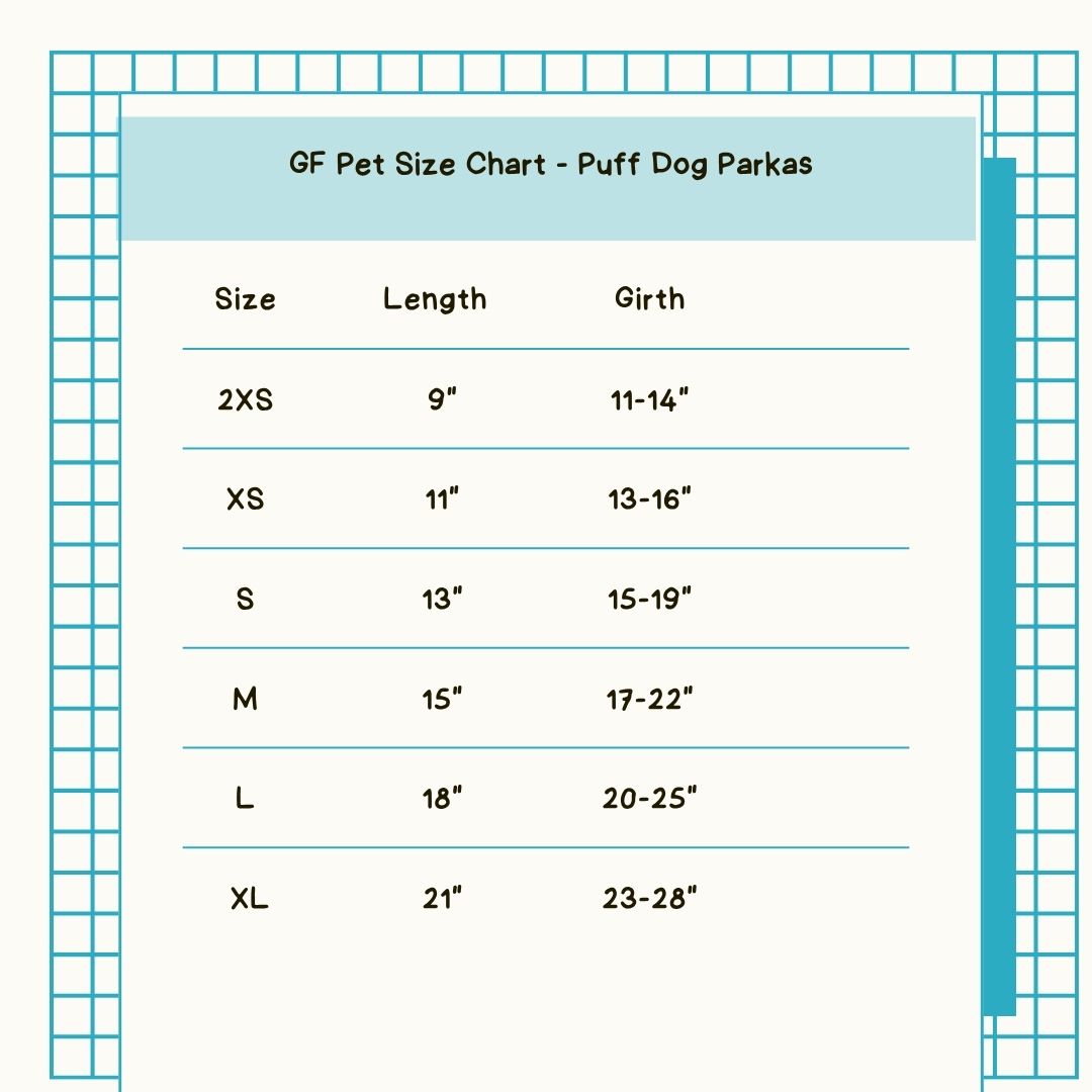 Both stylish and functional, we're certain you and your pup will love GF Pet's Puff Dog Parka in Hazel. With a waterproof shell and sumptuous soft popcorn Sherpa lining, the parka is designed to protect your pet from all the elements. Featuring an ultra puff design with a matching lined hood, the parka has oversized faux pockets with contrasting tabs and binding.