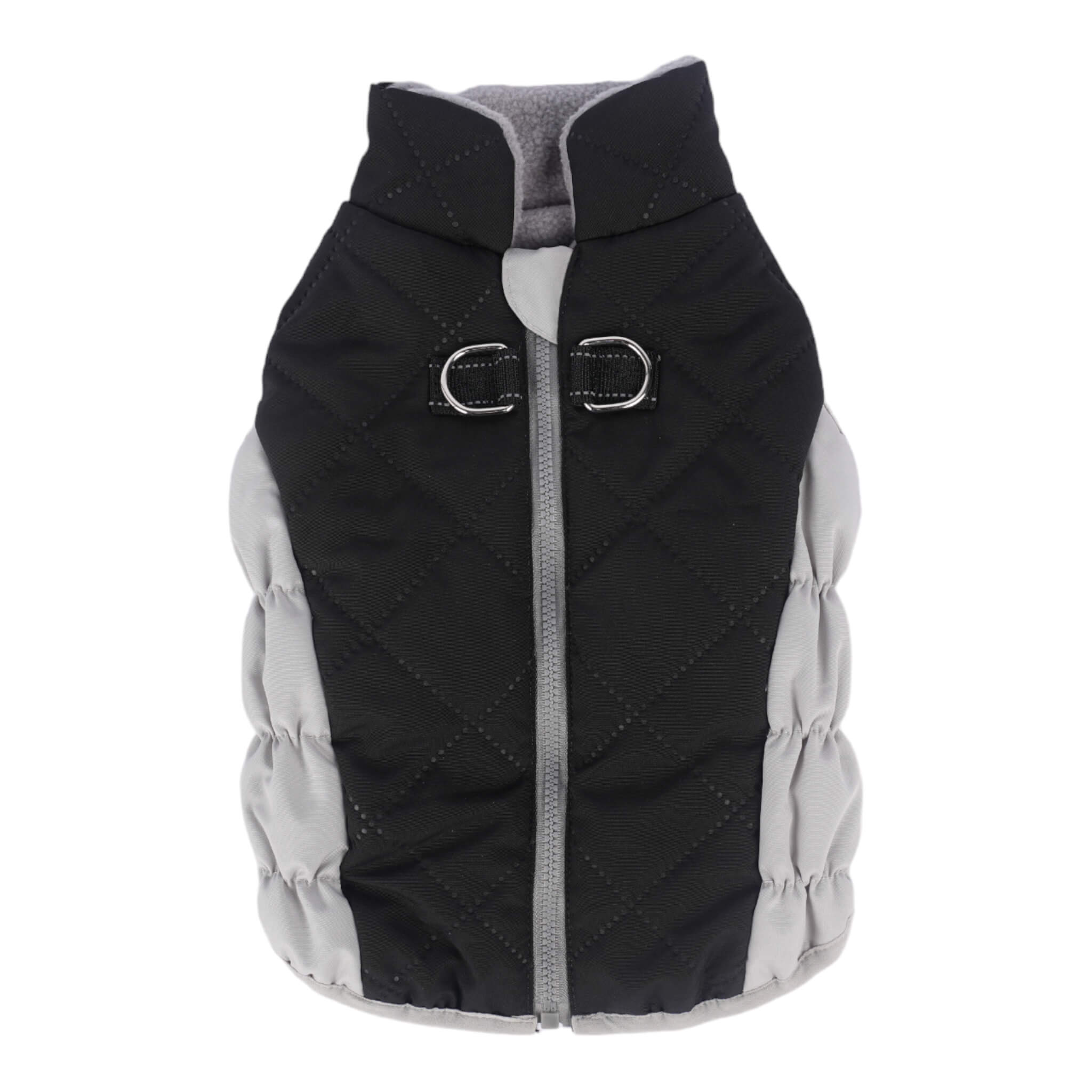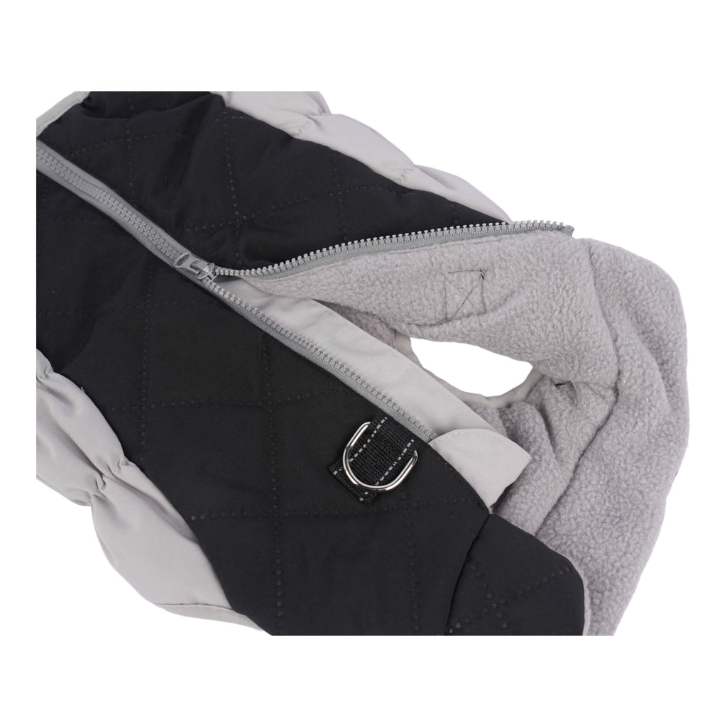 Featuring an attractive black and grey design, the coat is made up of a water-resistant outer shell to keep your dog dry and warm, while a soft, fleece lining will keep him cozy and comfortable. The step-in design with a zippered closure on the back makes the coat easy to put on and take off, while an adjustable, elastic waistband makes it easy to achieve a perfect fit. A convenient D-ring located on the back makes leash attachment simple, getting you ready for the great outdoors so much faster.