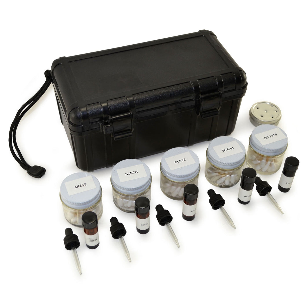 The kit comes complete with five different scent vials, featuring Anise, Birch, Clove, Myrrh and Vetiver essential oils. There are five jars, five eye droppers and cotton swabs. Also included is an aerated metal scent tin with a magnet and a convenient impact-resistant black carrying case.